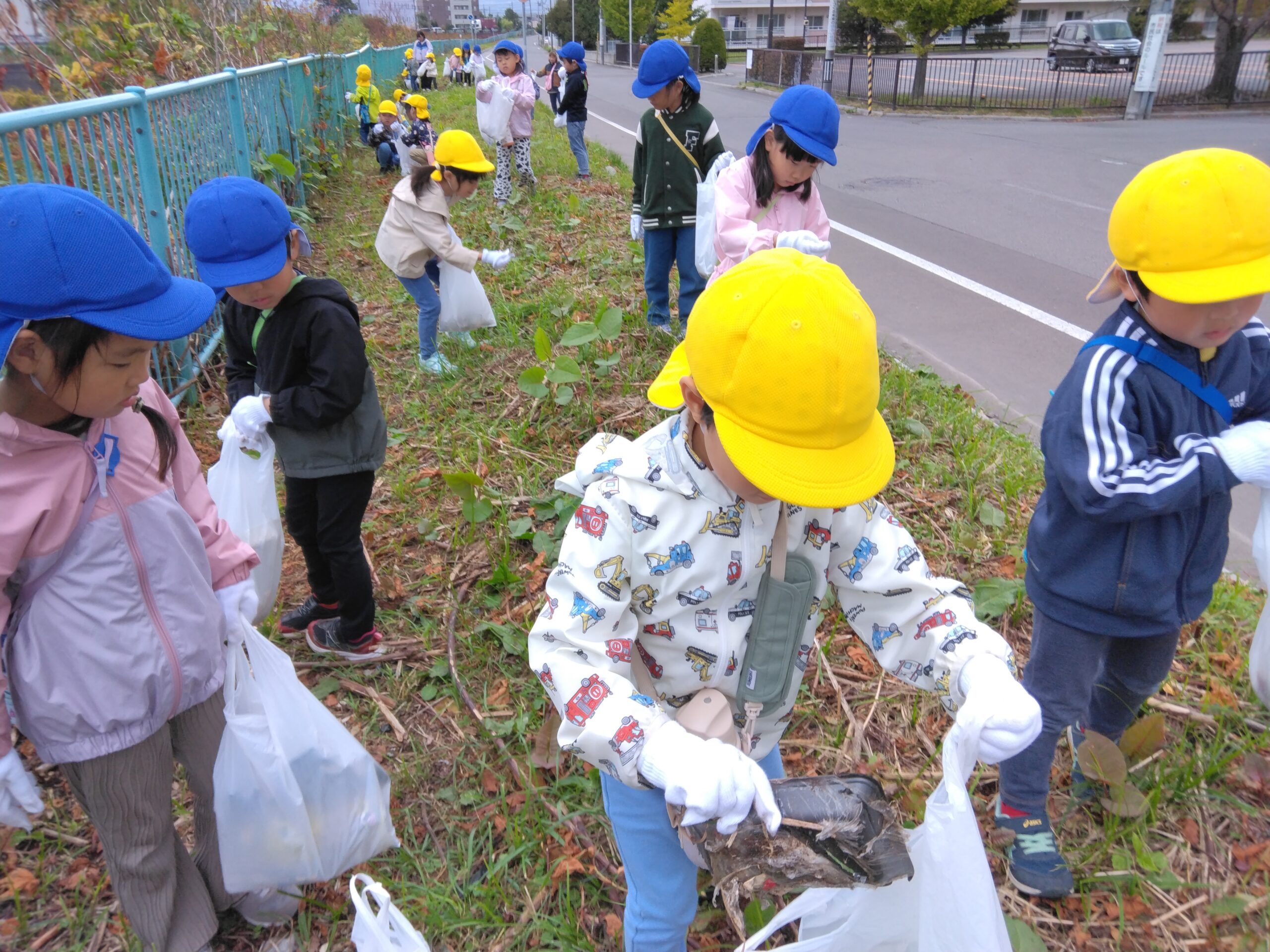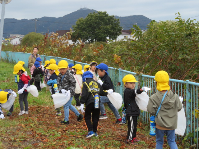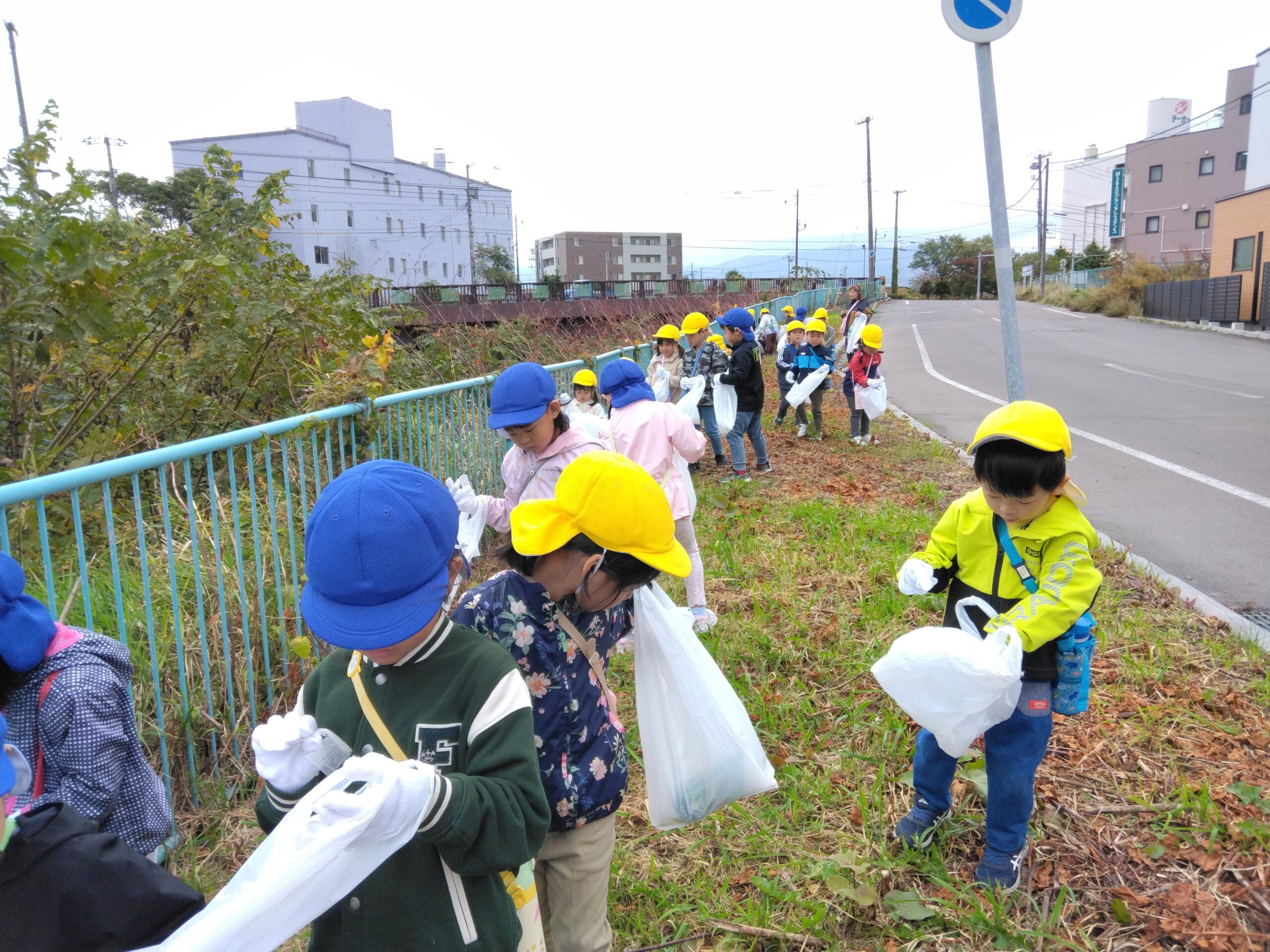 10月16日 さくら組、ひまわり組で亀田川沿いのゴミ拾いをしました。袋を持ち、軍手をつけていざ 出発!!たばこの吸い殻、ペットボトル、お弁当の容器など小さなものから大きなものまで袋いっぱい拾い、ピカピカ✨になりました!拾ったごみを「1,2,3…」と数えているお友達もいましたよ☺これからもみんなの住んでいる街をきれいにしようね👍