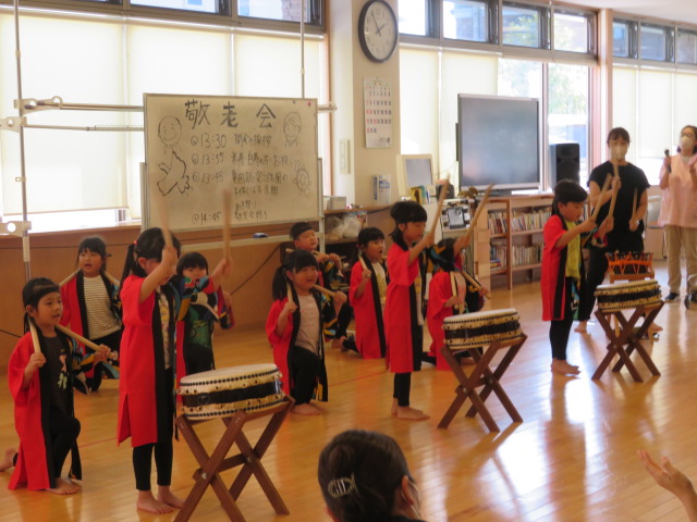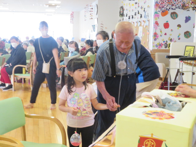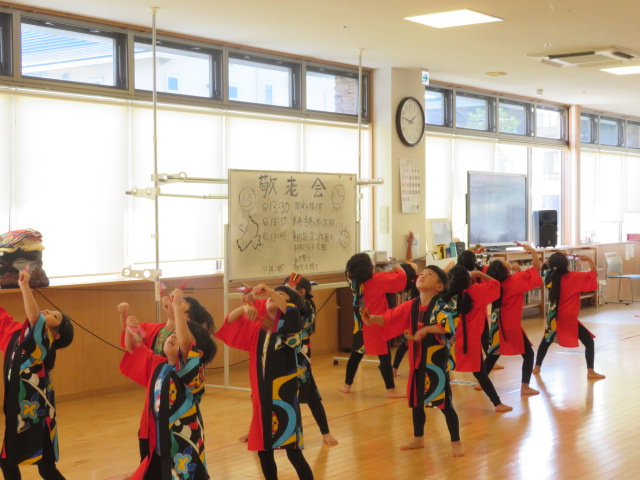 ハートTOハートさんの敬老会(秋まつり)に参加しました。子どもたちは、元気いっぱい、力いっぱいよさこいとかめださくら太鼓を披露しましたよ。涙を流して喜んでくれたおじいちゃん、おばあちゃんもいました。そのあとは、おじいちゃんやおばあちゃんと一緒に秋まつりを楽しみました。おててをつないで案内したり、綿あめづくりにもチャレンジしました!おじいちゃん、おばあちゃんからわたあめを何度もごちそうになったり、ヨーヨーももらい、子どもたちも喜んでいました。とてもほっこりした時間でした☺