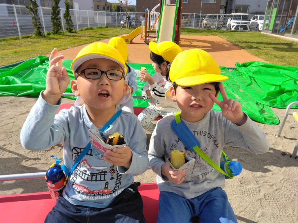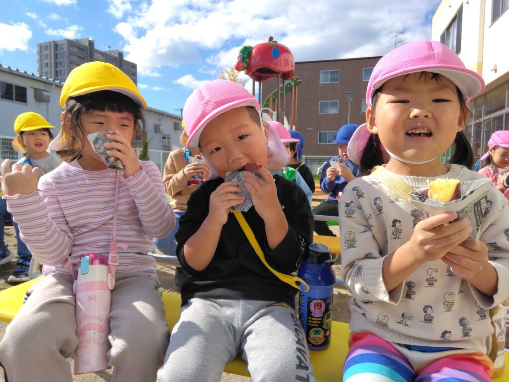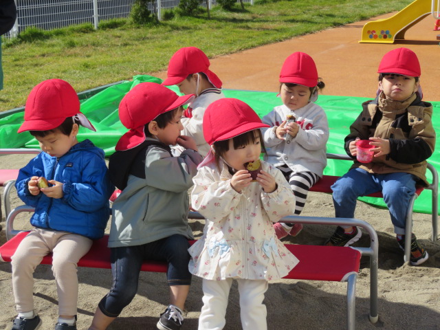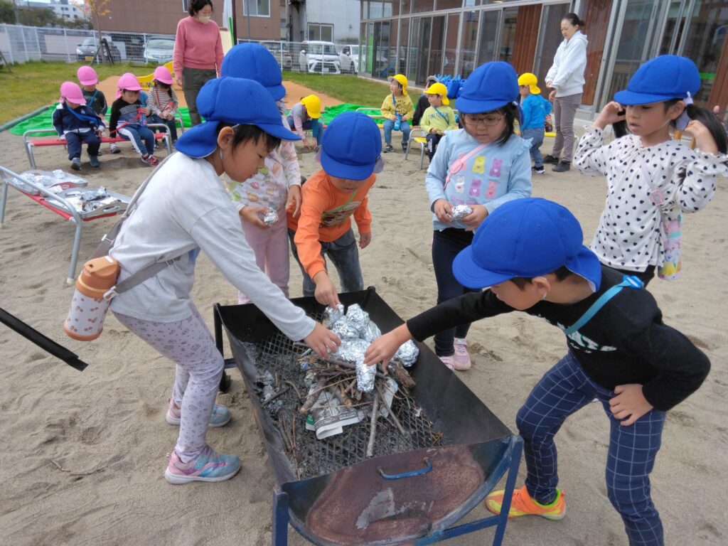10月24日(金) お散歩や遠足で集めた枝などを使ってやきいも会をしました。さつまいもを自分で包み、焼き芋の準備から楽しんでいた子どもたち・・・。お天気も良く、🎵やきいもグーチーパー🎵を歌いながらお芋が焼けるのを待ちました。ほかほか、ほくほくのあま~いやきいもにみんな「おいしい」と大喜びでおかわりをして食べていましたよ😋