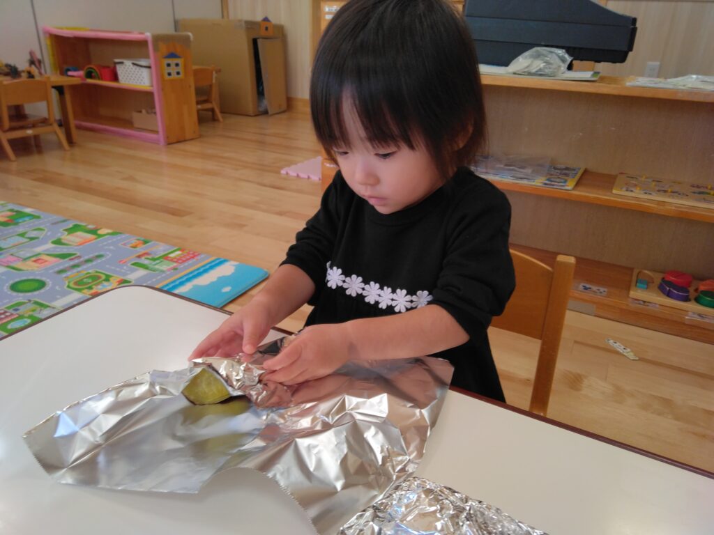 アルミホイルで焼きいも会で焼くさつまいもを自分で巻きました!