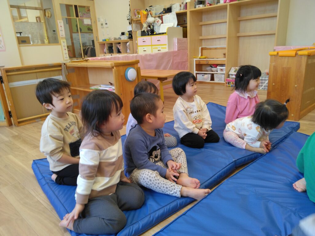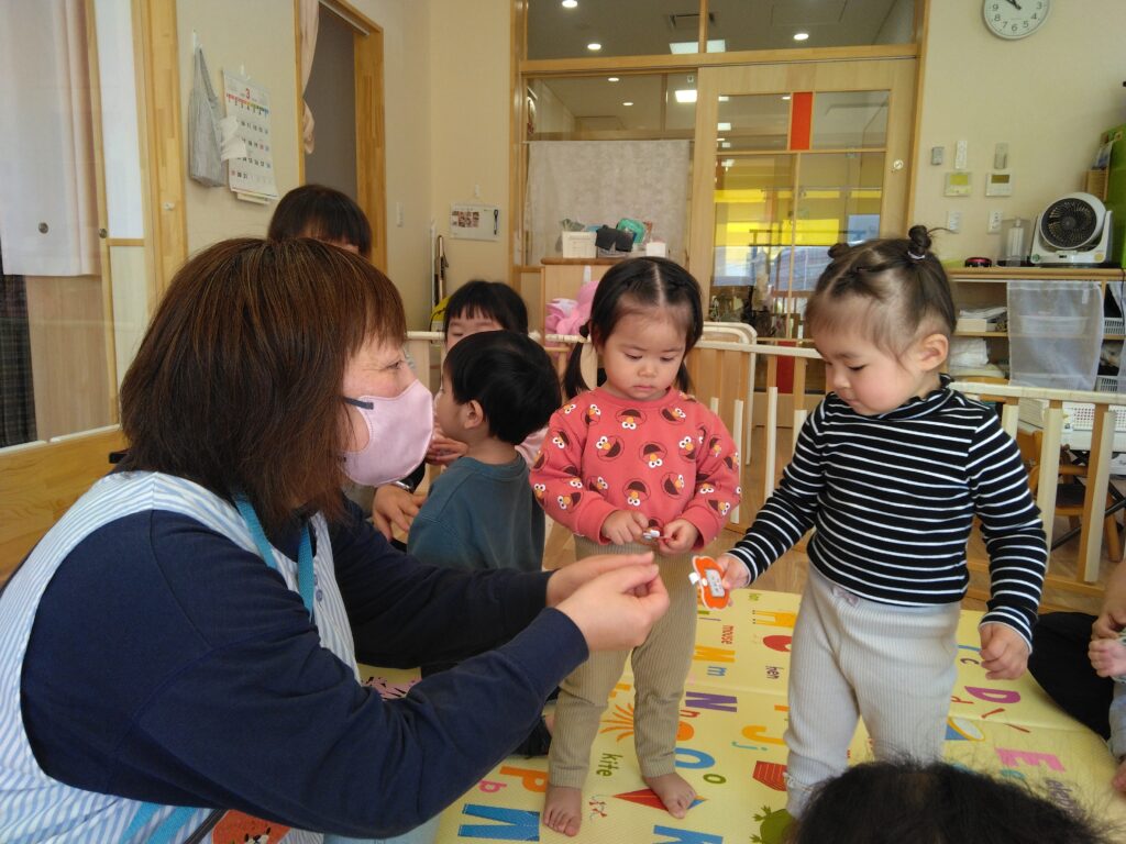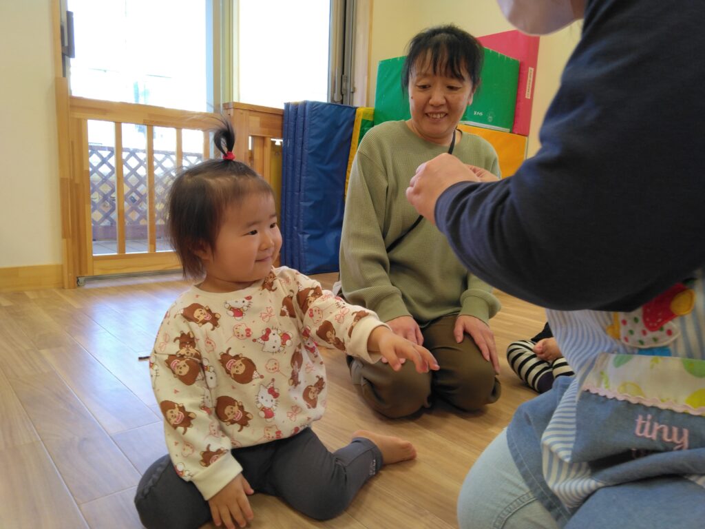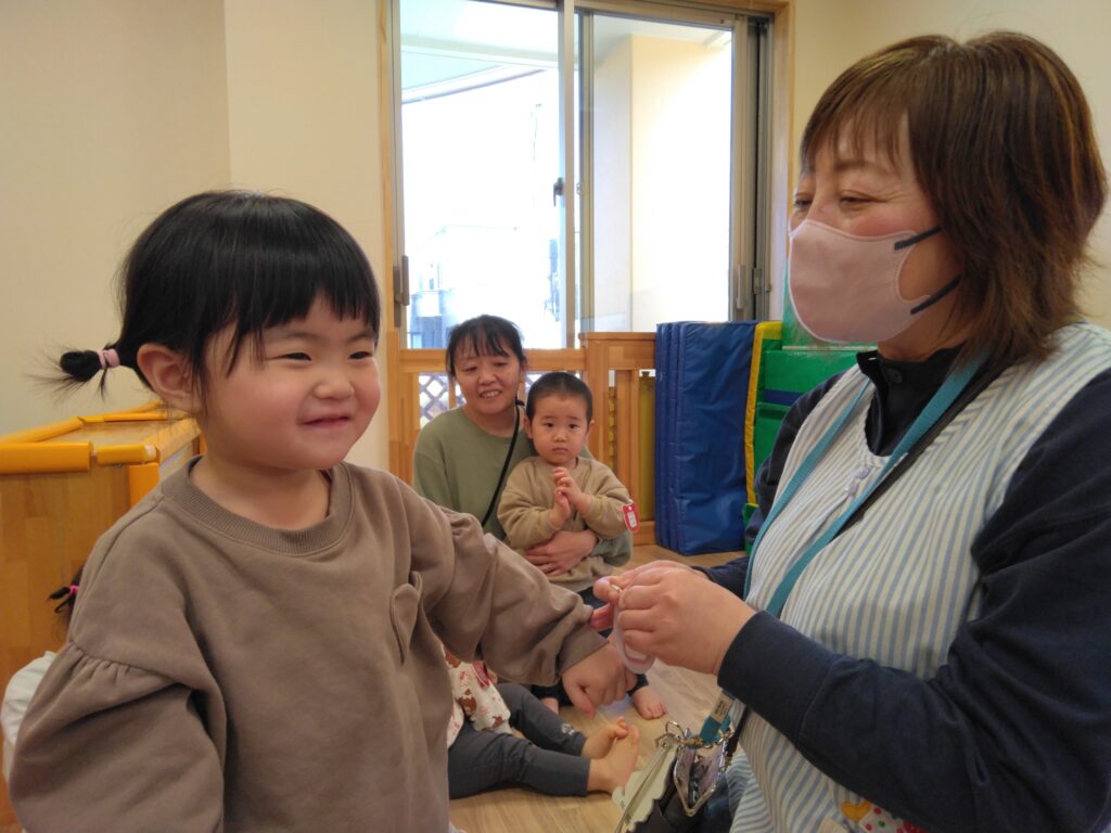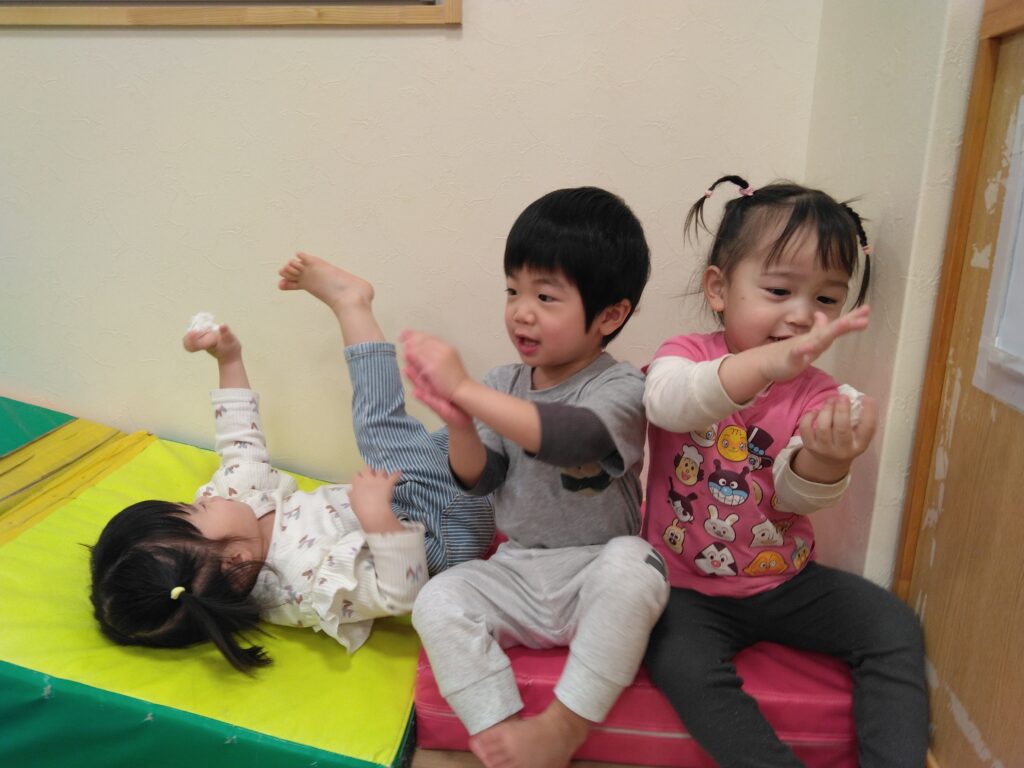 ♬おてぶしてぶしてぶしの中に…♪みんなでわらべ歌を楽しんでいます